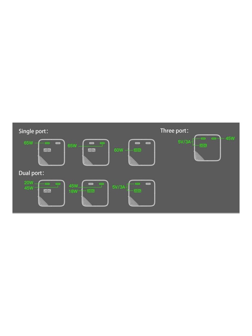 Aby korzystać z funkcji szybkiego ładowania, upewnij się, że używasz kabla obsługującego standardy szybkiego ładowania, takie jak Power Delivery (PD), Qualcomm Quick Charge, Samsung Adaptive Fast Charging, Huawei SuperCharge, OnePlus Warp Charge lub inne. Kabel musi również obsługiwać co najmniej 65 W mocy, aby w pełni wykorzystać potencjał ładowarki. Korzystanie z kabli o mniejszej pojemności może ograniczyć prędkość ładowania.