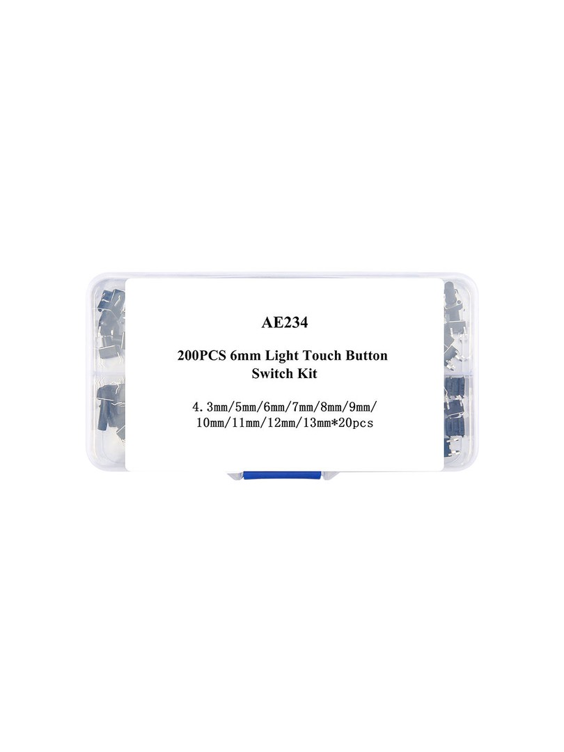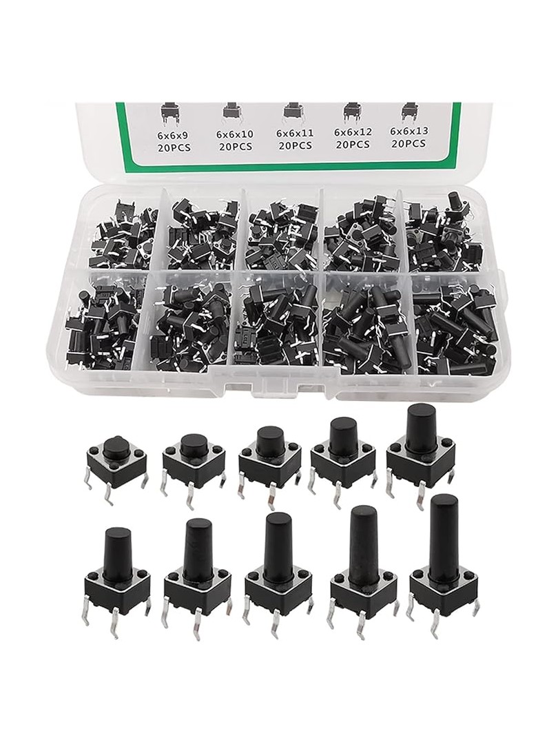 Zestaw dwustu przycisków taktowych ProRock to gotowy asortyment mikrowyłączników przewidzianych do wprowadzania danych użytkownika w obwodach elektronicznych i interfejsach sterujących. Przyciski o standardowej podstawie sześć na sześć milimetrów występują w dziesięciu wariantach wysokości actuatora, co umożliwia dopasowanie do różnych grubości paneli i obudów. Wszystkie elementy przechowywane są w plastikowym pojemniku ułatwiającym szybki wybór odpowiedniego wariantu podczas montażu i prototypowania.