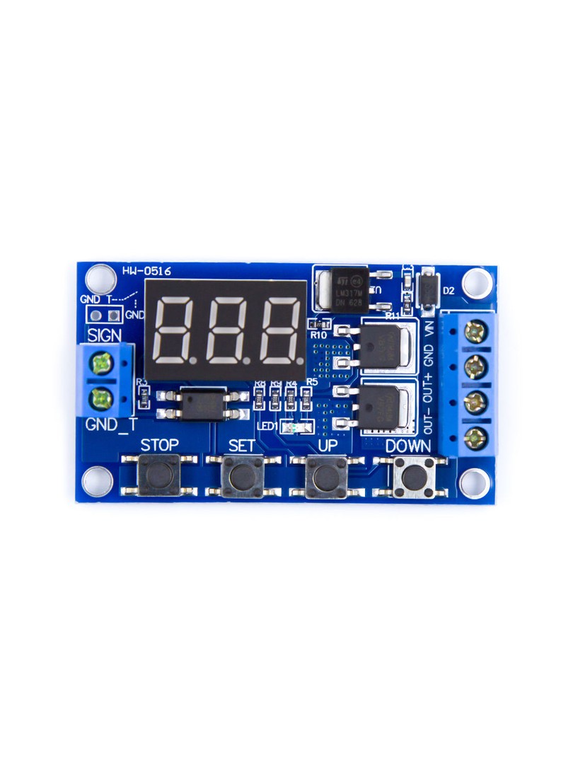 Układ wykorzystuje separację optoizolacyjną, zabezpieczenie przed odwrotną polaryzacją oraz nieulotną pamięć parametrów, które są zachowywane po odłączeniu zasilania. Wyposażony w funkcję STOP oraz tryb uśpienia wyświetlacza, moduł znajduje zastosowanie w automatyce przemysłowej i projektach hobbystycznych wymagających dokładny sterowania czasem włączania i wyłączania obciążenia.