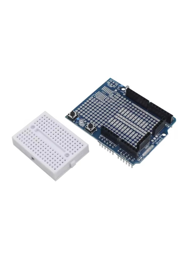 Shield podłącza się bezpośrednio do gniazd goldpin Arduino UNO R3 metodą stackowania. Wszystkie piny Arduino są wyprowadzone do dostępnych złączy na płytce. Zintegrowane komponenty testowe w postaci diod LED i przycisków upraszczają szybkie testowanie obwodów. Elastyczne prototypowanie odbywa się poprzez wykorzystanie płytki stykowej do obwodów tymczasowych lub pól lutowniczych do montażu z tworzywa.