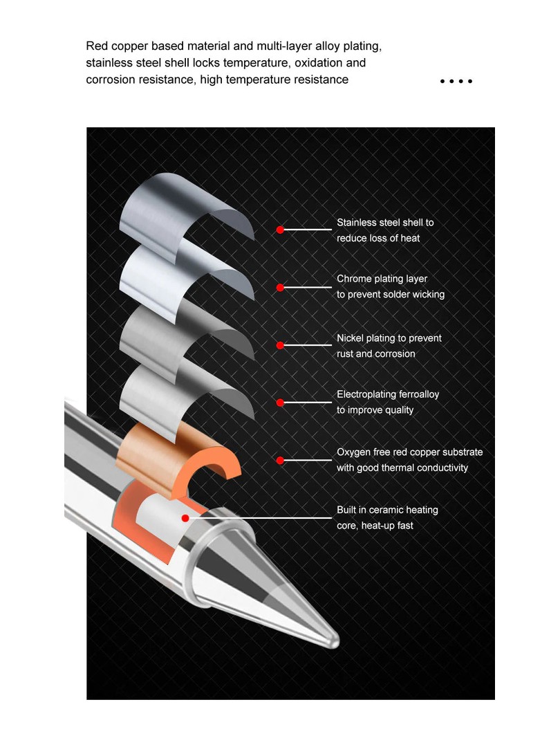 - Chroniący środowisko grot lutownicy, szybkie przewodzenie ciepła, łatwe cynowanie, szybkie nagrzewanie.