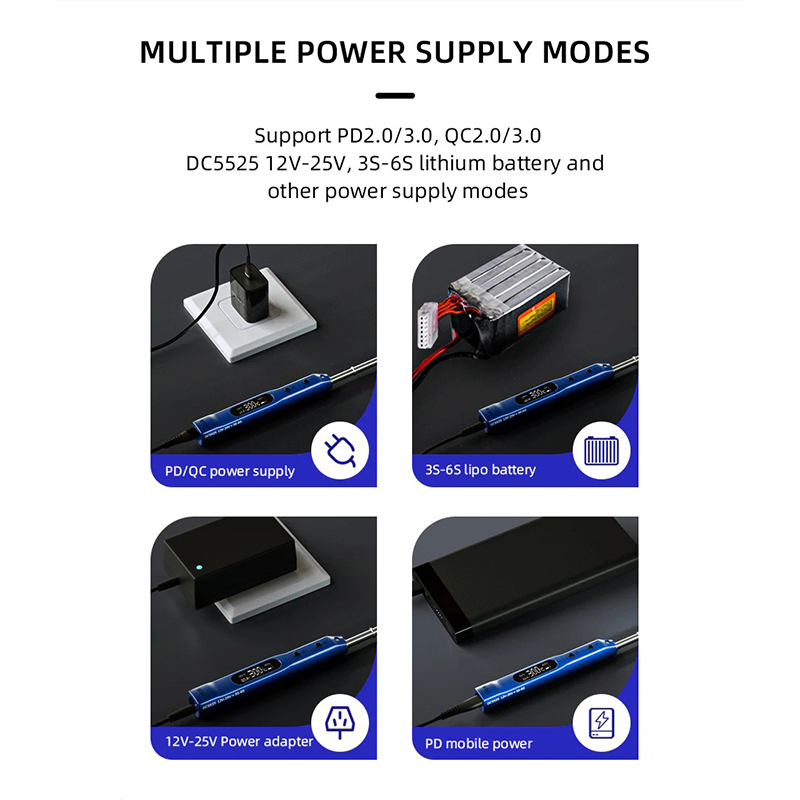 • Potężna i regulowana wydajność: Działa z zakresem roboczym zasilania DC 12V-25V, w tym standardami PD3.0, QC2.0 i obsługą baterii 3S-6S. Moc wyjściowa różni się w zależności od używanej końcówki: Końcówka T12 do 65 W, końcówka TS do 75 W, a końcówka SI do 100 W.
