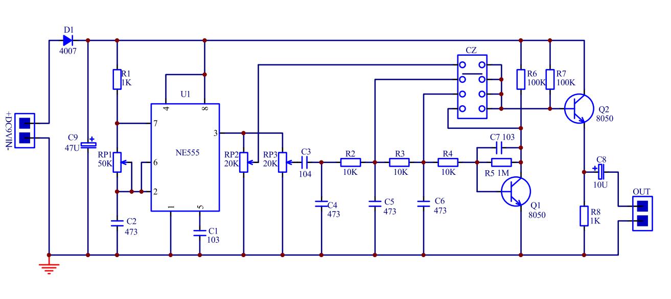 W obwodzie D1 jest diodą zapobiegającą odwrotnemu podłączeniu zasilania, a C9 jest kondensatorem filtrującym. U1, R1, RP1 i C2 tworzą generator fali prostokątnej. Sygnał jest wyprowadzany ze styku 3 U1. Regulacja RP1 może zmienić częstotliwość fali prostokątnej, około 0,5-20 kHz. C1 jest kondensatorem przeciwzakłóceniowym. Wyjście fali prostokątnej z pinu 3 U1 jest regulowane przez RP2 i wyprowadzane z S1. Po wyregulowaniu przez RP3, sprzężeniu przez C3 i podzieleniu przez C4, przechodzi przez obwód całkujący R2 i C5, tworząc kształt fali piłokształtnej i jest wyprowadzany z S2. Następnie przechodzi przez obwód całkujący następnego poziomu R3 i C6, tworząc falę trójkątną i jest wyprowadzany z S3. Wreszcie, po przejściu przez R4, jest wzmacniany przez obwód wzmacniacza złożony z C7, R5, Q1 i R6 i staje się falą sinusoidalną na kolektorze Q1. R7, R8 i Q2 tworzą obwód wzmacniacza wtórnika emitera. Na koniec sygnał jest sprzęgany przez C8 i wyprowadzany z końcówki wyjściowej.