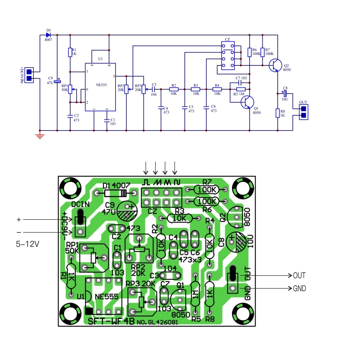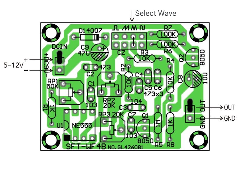 Układ scalony, dioda przeciwsobna, kondensator elektrolityczny i tranzystor w obwodzie są elementami polarnymi. Należy uważać, aby nie zainstalować ich w odwrotnym kierunku. Należy zapoznać się ze schematem obwodu, aby dokładnie dobrać parametry komponentów. Wszystkie komponenty powinny być zainstalowane blisko powierzchni płytki drukowanej, a powierzchnia identyfikacji komponentów powinna być umieszczona w kierunku dogodnym do obserwacji. Napięcie zasilania może wynosić 5-12V. Im wyższe napięcie, tym mniejsze zniekształcenia fali. RP1 służy do regulacji częstotliwości, RP2 służy do regulacji amplitudy fali prostokątnej, a RP3 służy do regulacji amplitudy fali innej niż prostokątna. Regulacja częstotliwości i amplitudy wpływa na kształt fali wyjściowej. Kształt fali 1-3 kHz tego obwodu jest względnie normalny.