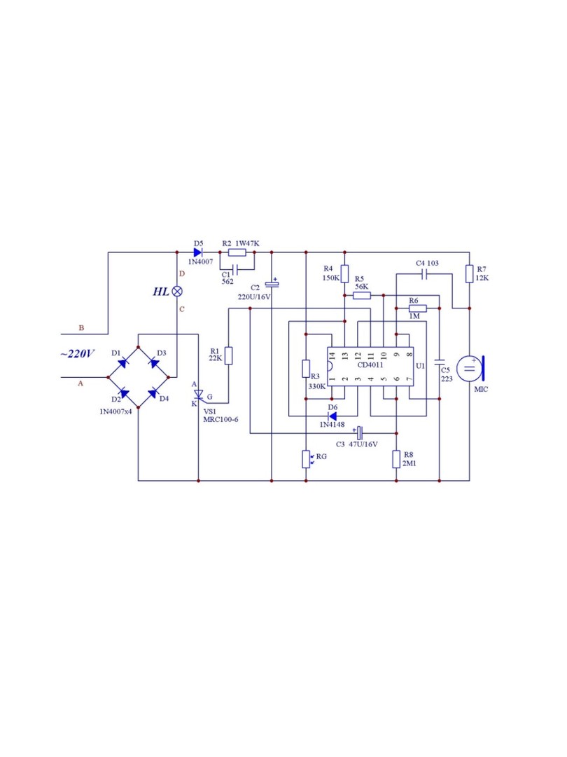 Gdy dźwięk (taki jak kroki lub klaskanie) jest wykrywany przezmikrofon elektretowy (MIC), jest on konwertowany na sygnał elektryczny i kształtowany przez bramkę NAND CD4011.Aby zapobiec aktywacji w ciągu dnia, obwód zawiera fotorezystor (RG) i dzielnik napięcia (z R3) dla wrażliwości na światło. Gdy jest ciemno, rezystancja RG jest wysoka, co pozwala obwodowi reagować na dźwięk.