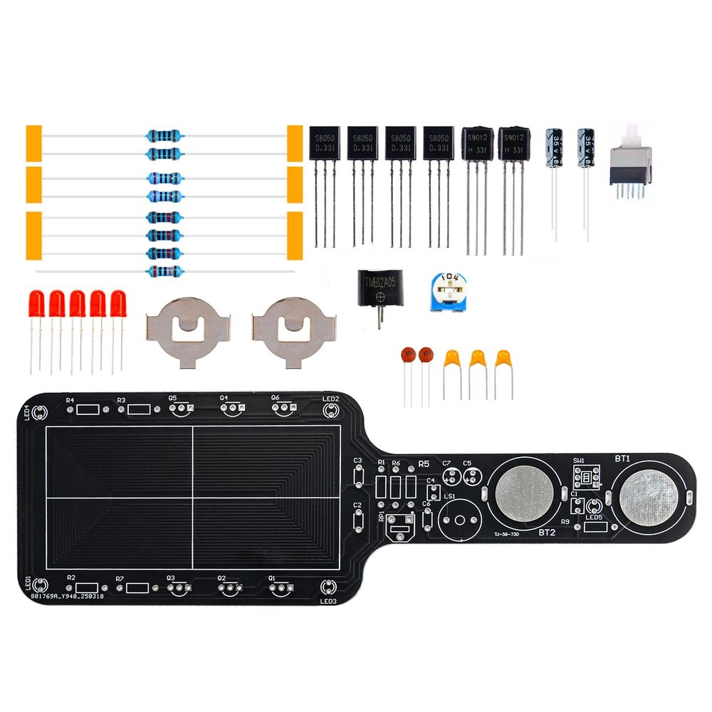 Ten zestaw do samodzielnego montażu wykrywacza metali stanowi doskonałe wprowadzenie do elektroniki dla początkujących, zapewniając jednocześnie prawdziwą wartość funkcjonalną. Po zmontowaniu to kompaktowe urządzenie może wykrywać metalowe przedmioty z odległości 3-5 cm, z czułością regulowaną za pomocą potencjometru.