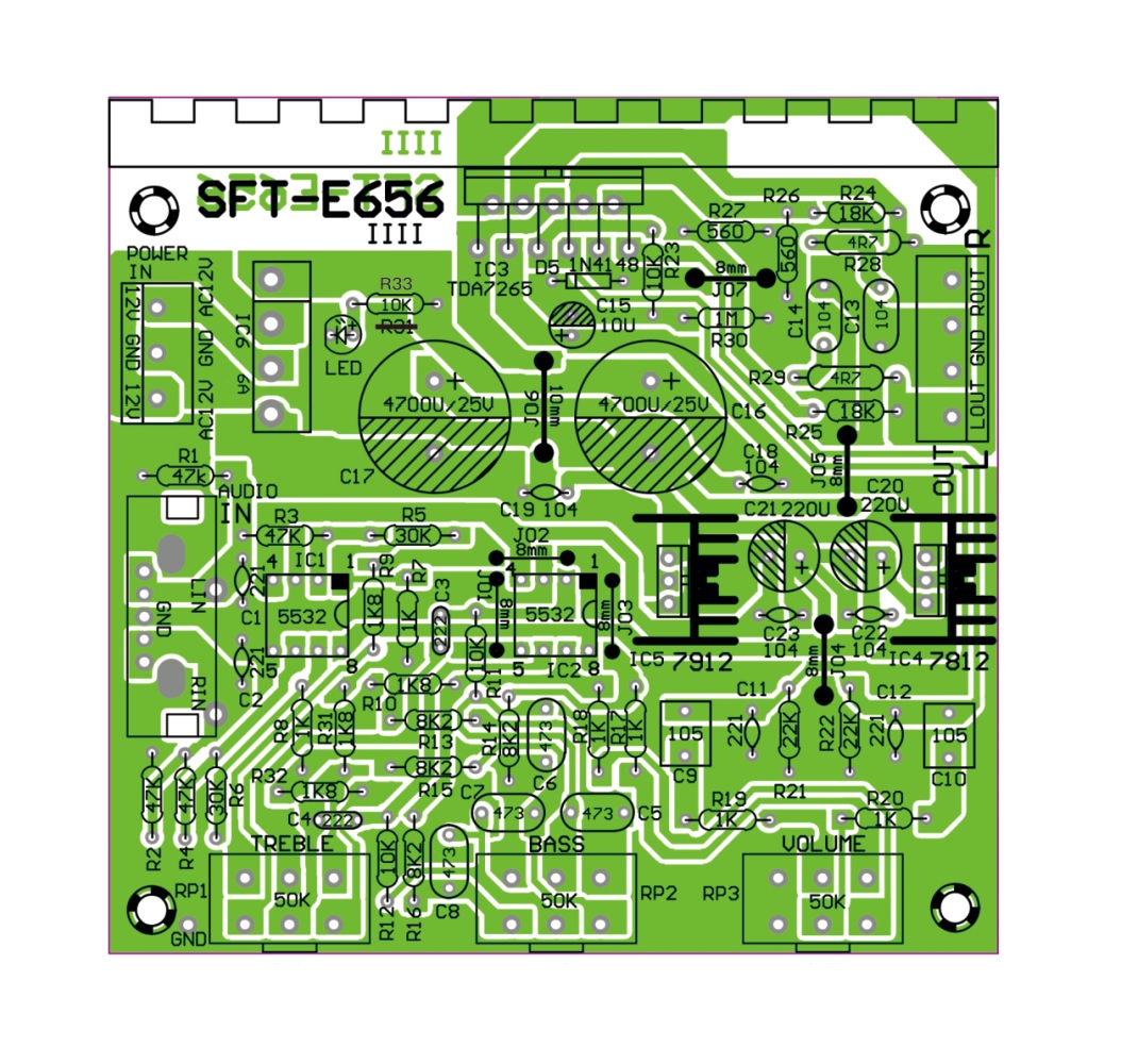 • Stabilne zasilanie regulowane: Regulatory napięcia 7812 i 7912 dostarczają czyste napięcie ±12 V do stopnia przedwzmacniacza.