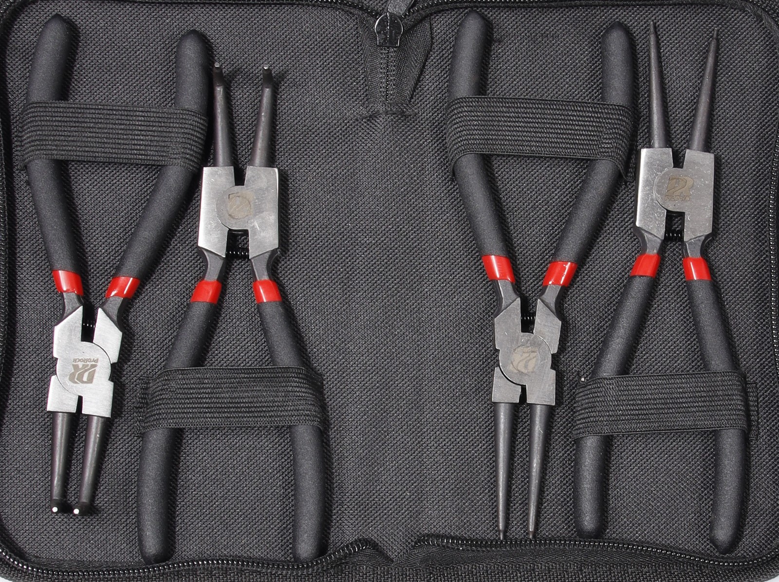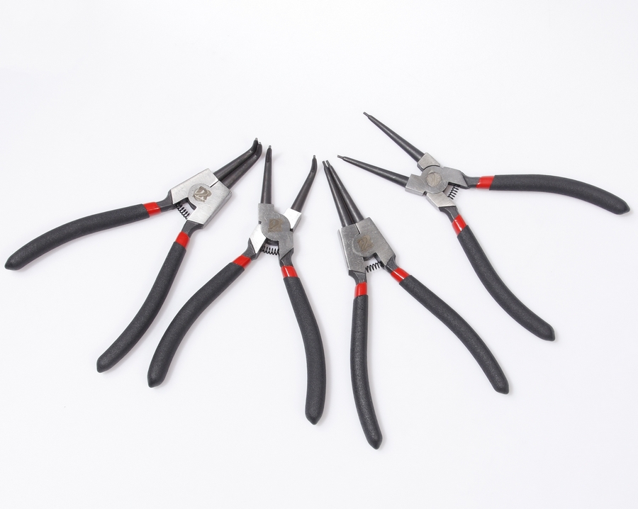 Profesjonalny zestaw szczypiec do pierścieni osadczych wykonany ze stali 45 z wygodnymi rękojeściami z PP, charakteryzujący się klasycznym czarno-czerwonym wzornictwem.